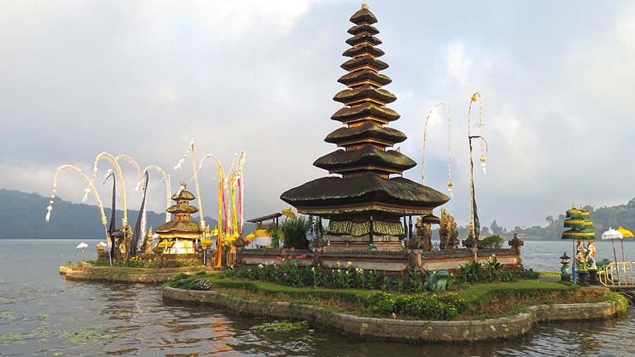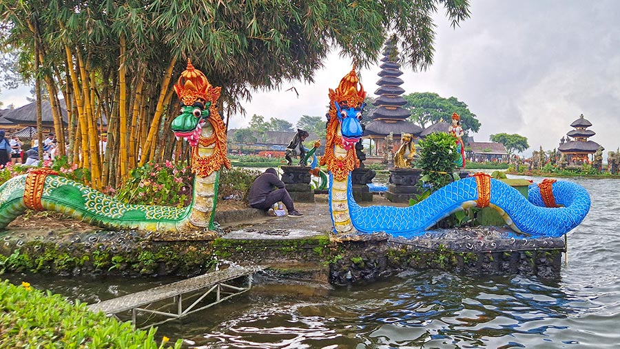Built in the 17th century, it honors the Hindu trinity (Brahma-Vishnu-Shiva) and marks the importance of the lake as the main source of water in the region. The complex contains very nice gardens and elements such as Naga (mythological snakes) that decorate the temple grounds. Although it is primarily a Hindu sanctuary dedicated to the goddess of prosperity, Dewi Danu, the presence of a Buddhist stupa within the complex symbolizes religious harmony on the island.