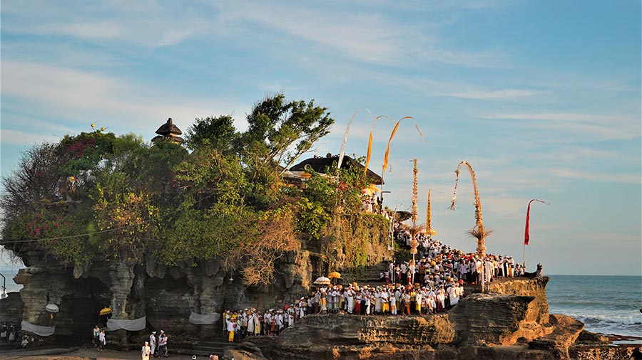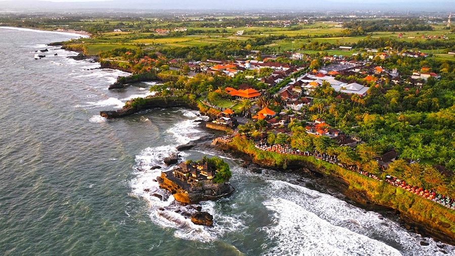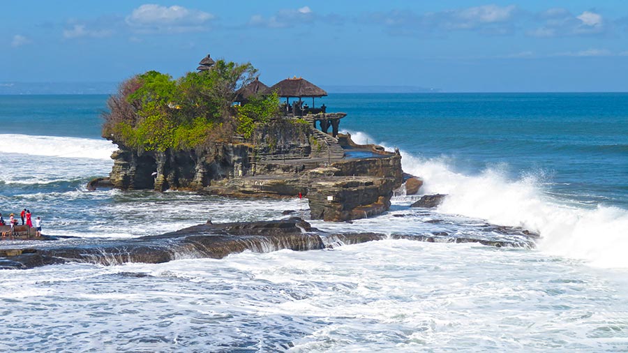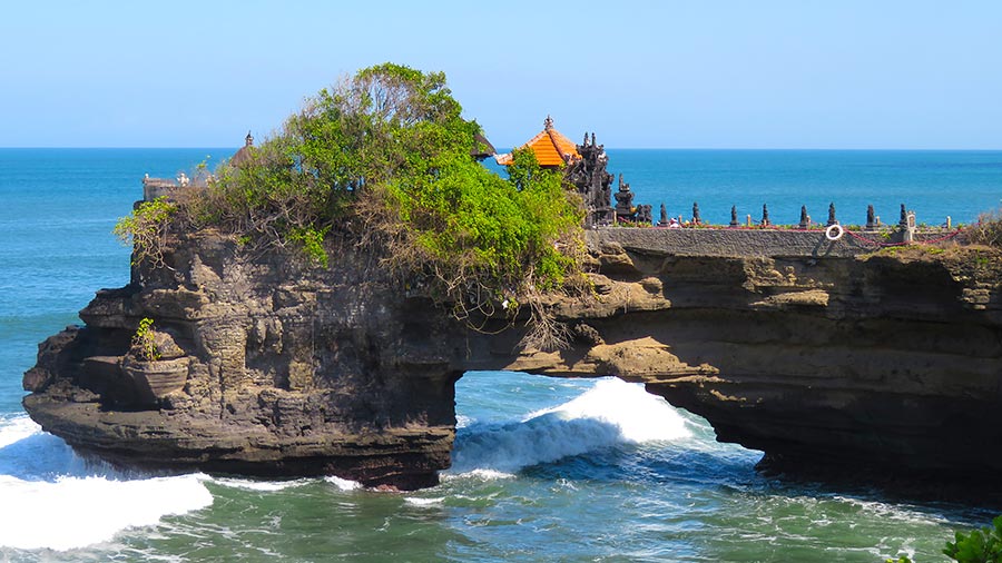 Tanah Lot is one of the most famous and photographed temples in Bali, known for its dramatic location on a rocky formation in the middle of the sea. This sanctuary, dedicated to the protective spirits of the ocean, is one of the island’s most important sea temples and a true symbol of Balinese culture. Its silhouette against the horizon has become an iconic image that attracts travelers from all over the world. To the right of the main temple stands Batu Bolong Temple, built on a cliff with a natural rock arch carved by the waves. This striking formation creates a stunning, highly photogenic scene that beautifully complements the visit to Tanah Lot.
